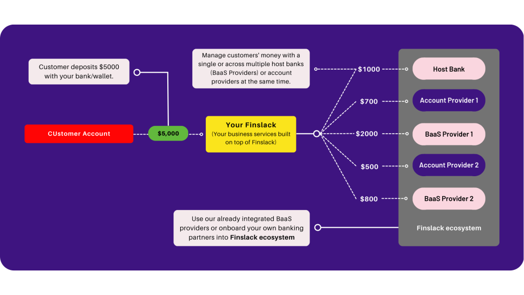 Plug into Finslack’s fast-expanding ecosystem of banks and BaaS platforms so you can hold customers’ money across multiple banks at a time without friction.
